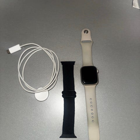 Apple Watch Series 7 45mm smartklokke i svart farge med svart lærreim. Klokken er godt brukt med ripete skjerm og en ripe i urkassen. Ellers fungerer klokken fint!