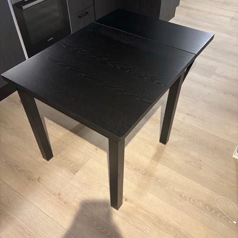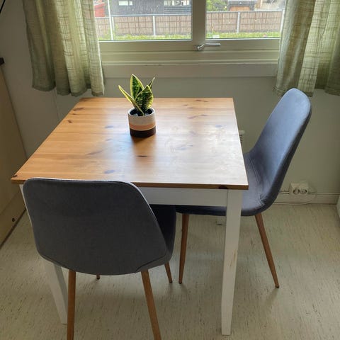 Selger unna et lite spisebord med to stoler. Ikke tatt i bruk hos oss som spisebord, ble kjøpt for bildetakning til visning.