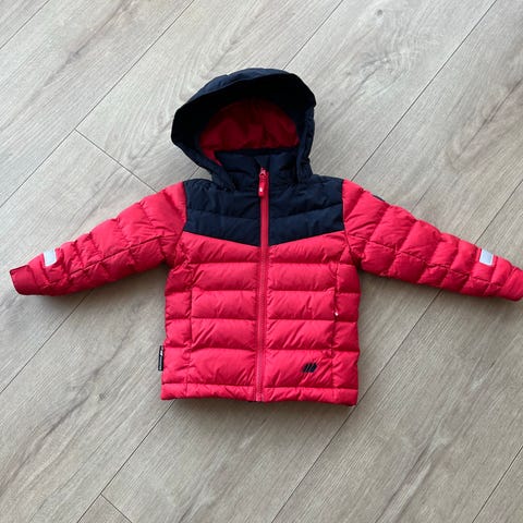 Fint brukt dunjakke. Rød og svart. Desverre fått noen svarte flekker på armene ognlitt bak( se bilder).