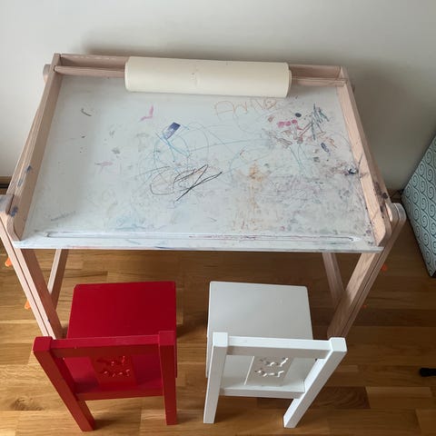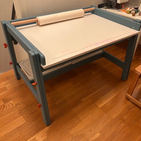 KEA FLISAT barnepult, høydejusterbar, i oransje farge. Passer godt til tegning, lek og lekser. Høyden kan tilpasses etter barnets alder, så den kan brukes i flere år.