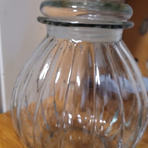 Norgesglasskrukke med lokk i klart glass. Krukken har pregede detaljer og et metallokk med tetningsring. Egnet til oppbevaring av matvarer eller andre små gjenstander.H=19cm