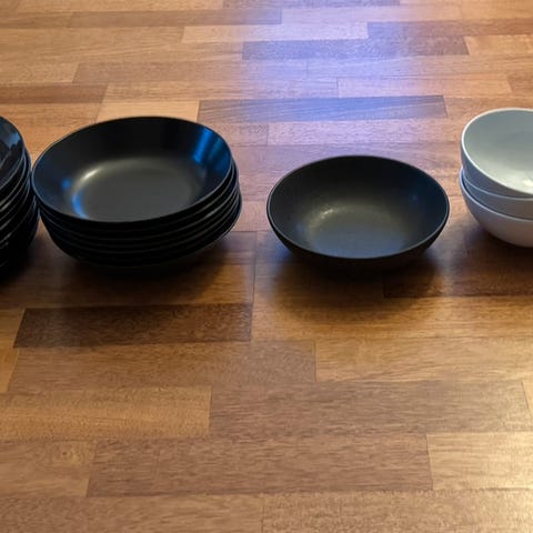 Pastatallerkner / skåler fra IKEA. Pent brukt, normale bruksmerker men 1 av fatene har en avknukket bit (se bilde). Det er totalt 7 tallerkner som selges samlet for 300kr.