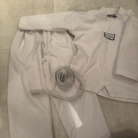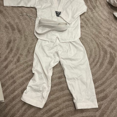Pent brukt drakt bukse og jakke med fult og hvit belte