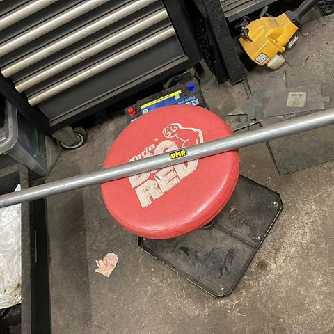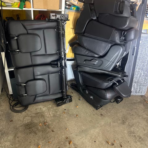 To bilseter i grått stoffmateriale.Fra Ford Sierra XR4 En av setene har slitasje på ryggen.og mangler rattet for justering av ryggen.