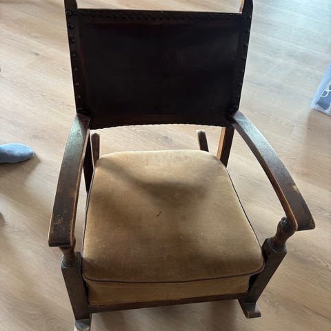 Gyngestol laget i tre med polstret sete og rygg i grått stoff. Stolen har dekorative nagler langs kantene og detaljer i treverk på ryggstøtten og armlenene. Designet for komfort og avslapning.Det mangler noen nagler på den ene siden foran i ryggen men kan lett fikses med nye eller nappe noen fra baksiden. Det er ingen slitasje på stoffet. God gyngeeffekt. Selges for kr 300,-. Må hentes innen mandag kl 11.00. Da går den til gjenbruk. Det følger med to vegglampetter og en 5 armer lysekrone fra Høvik som er i god stand. Oksydert.
