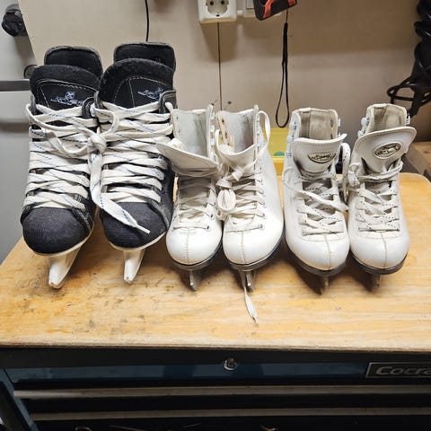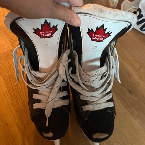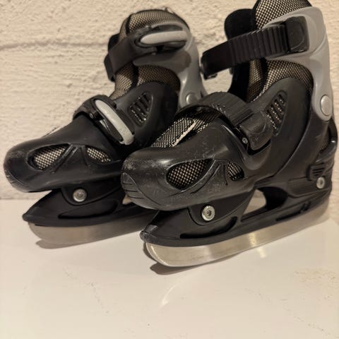 Blå/kvite regulerbare hockeyskøyter i str. 30-33 til sals. Hentast i Volda sentrum.