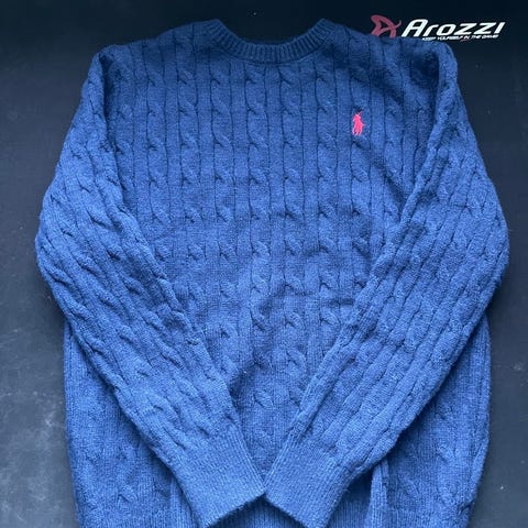 Selger denne blå polo genseren som er myk og komfortabel, perfekt for vinteren