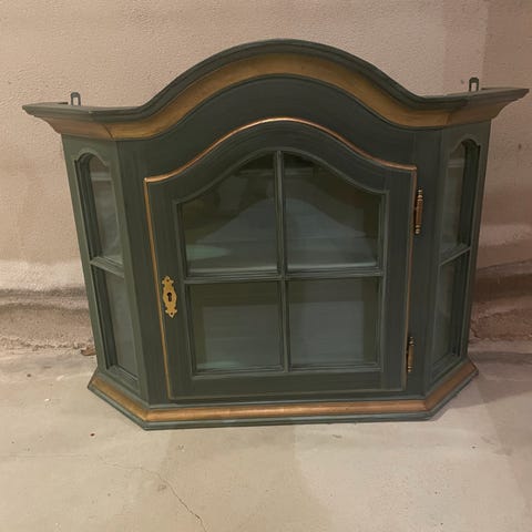 Vitrineskap med glassdør og 4 glasshyller. Vitrineskapet har også stikkontakt og sokkel til å koble på lys. Passer til oppbevaring og visning av dekorative gjenstander.