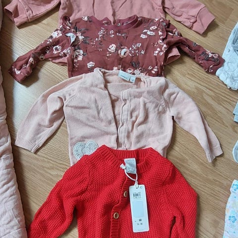 Selger en stor og variert klespakke i størrelse 68, brukt av ett barn født i mai. Klærne dekker flere sesonger og inneholder både hverdagsplagg, yttertøy og varme ullplagg. Mye er jentepreget, men flere plagg er også fine kjønnsnøytralt.