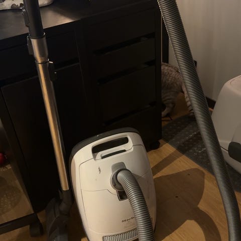 Miele kompakt støvsuger i hvit farge. Utstyrt med fleksibel slange og standard munnstykke. Egnet for generell rengjøring i hjemmet.
