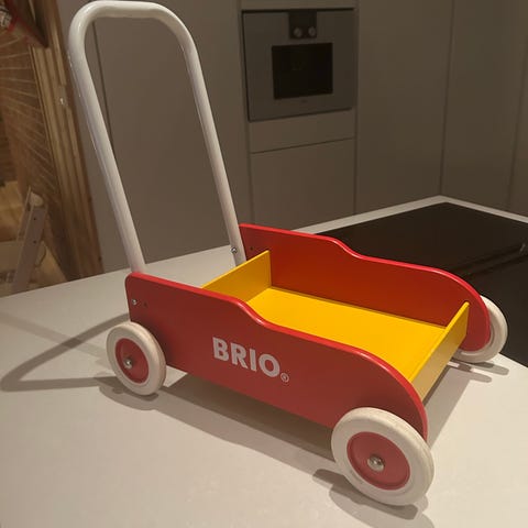 Klassisk BRIO gåvogn for de minste, gul/rød. Har bruksmerker, men fungerer helt fint, mye bruk igjen.