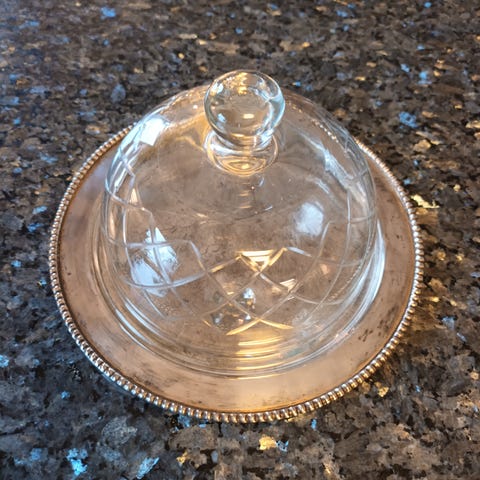Retro Glass osteklokke med lokk, gjennomsiktig materiale. Designet for oppbevaring av ost eller lignende på kjøkkenet. Har håndtak på lokket for enkel åpning. En liten skade på lokket, se på bilde. Retro osteklokke fra 50-tallet.