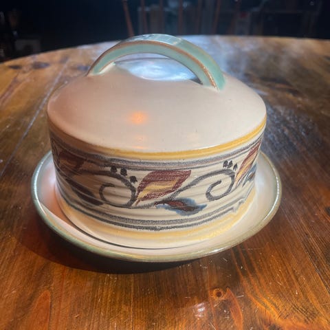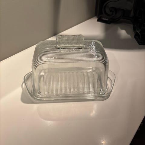 Retro Glass osteklokke med lokk, gjennomsiktig materiale. Designet for oppbevaring av ost eller lignende på kjøkkenet. Har håndtak på lokket for enkel åpning. En liten skade på lokket, se på bilde. Retro osteklokke fra 50-tallet. sendes pr. post når pengene for varen og frakten er vippset til meg.