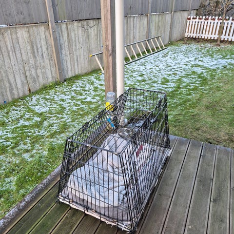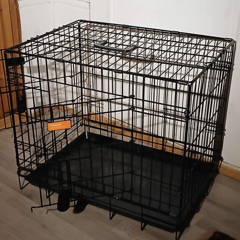 Metall bur for kjæledyr med svart plastbunn. Bur med dobbeltdørsløsning og solid konstruksjon, egnet for oppbevaring eller transport av små til mellomstore dyr. B 77 D48 H 56