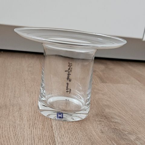 Vasen er munnblåst og av høy kvalitet.Den er i svært god stand,er blank og fin i glasset,og det orginale merket sitter fortsatt på.Høyde på vase 18 5 cm, 6 cm der blomsten settes i.