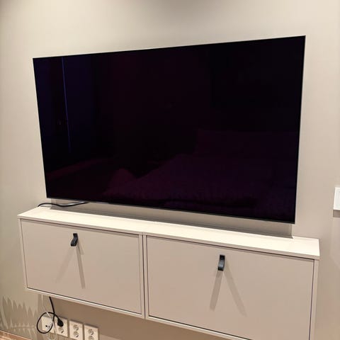 Det medfølger veggstativ/bordstativ og to fjernkontroller.