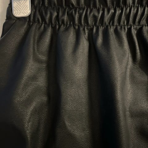 ONLY skinnimitasjonskjørt i svart farge, størrelse M. Laget av polyester materiale. Skjørtet har elastisk midje med knapper foran.