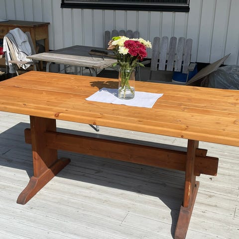 Flott langbord i god stand selges uten stoler. Tykk og massivt tre i furu. Topp plate er 5 cm tykk ubehandlet furu så her er det fritt frem om man ønsker lakke eller olje. Pris kan diskuteres ved rask avgjørelse. Må hentes i Hønefoss. Tilkjørt kun lokalt i området Ringerike/Hole. Kan evnt skje med avtale om frakt innenfor rimelig avstand.