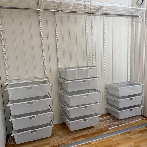 Skap i metall med smart oppbevaring. Vi har brukt skapene til barneklær for enkel organisering av sko, jakker og diverse til barna