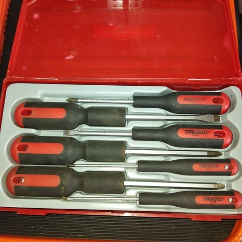 Teng Tools skrallesett med piper levert i rødt etui. Settet inkluderer flere piper og en skralle, egnet for mekanisk arbeid og reparasjoner. Verktøyene er laget for presisjonsbruk og oppbevares praktisk i et kompakt etui.
