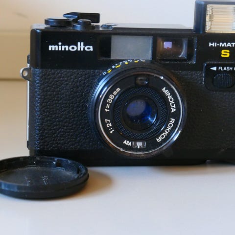 Minolta Hi-Matic AF filmkamera i svart farge. Kompakt design med innebygd blits og autofokus. Kameraet er utstyrt med manuelle og automatiske innstillinger for enkel bruk. Passer til analog fotografering med 35 mm film.