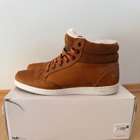 Polo Ralph Lauren Sneakers joggesko i størrelse 44. Skoene har en kombinasjon av tekstil og skinnmaterialer med blå og brune detaljer.