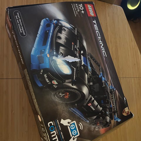 LEGO Porsche 911 GT3 RS byggesett i hvit farge med detaljer i svart og rødt. Modellen er en replika av Porsche 911 GT3 RS sportsbil, designet for samling og bygging.