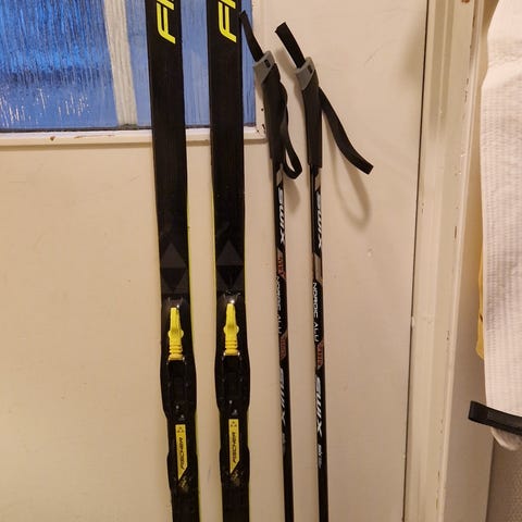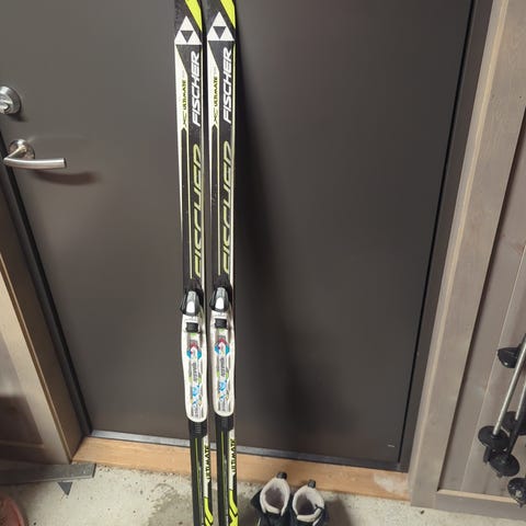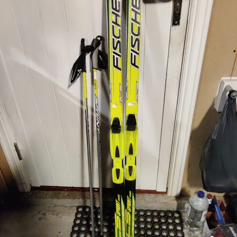 Fisher felleski junior med binding og Leki staver (115cm) selges samlet.