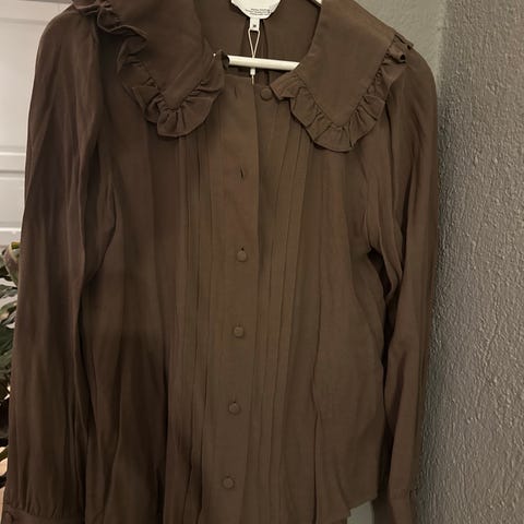 Cathrine Hammel bluse i størrelse L for kvinner, laget av resirkulert polyester. Stoffet føles som silke og har et fint fall. Blusen har brun farge og detaljer som rynkede mansjetter og en dekorativ krage. Den har belte i livet for justering av passform.