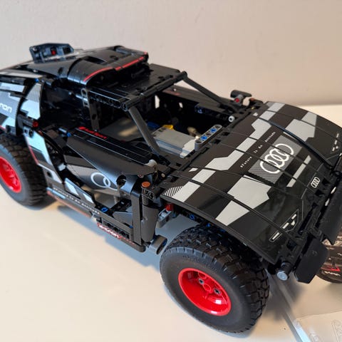 LEGO Technic Audi RC bil med svart karosseri og røde hjul. Modellen er detaljert og representerer en Audi terrengbil med funksjonelle dører og realistiske dekk.