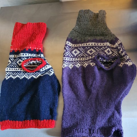 Strikket en ullgenser som dekker mye av hunden på kalde dager. Min har dessverre blitt for stor for den før den ble tatt i bruk, kun prøvd på (se bildet). Selges derfor til noen som er litt mindre :)