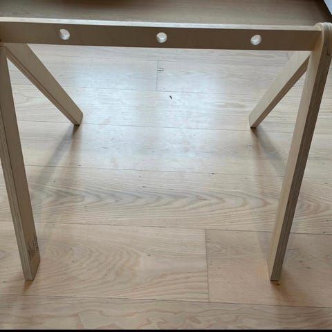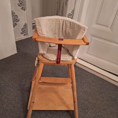 Barnestol selges, kan slåes sammen til lekebord med hjul.