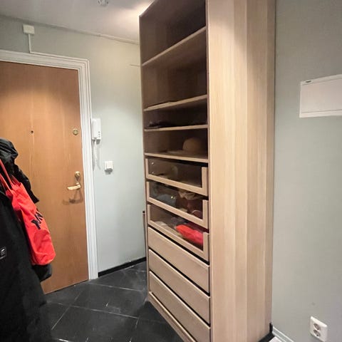 Utover dette er garderoben i grei/brukt stand. Må hentes. Vi kan bistå med demontering og bæring til bil.