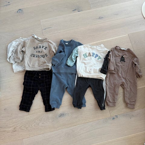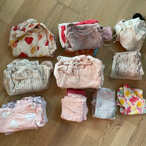 4 bukser i bomull / bambus i str 80, en hvit strømpebukse i bomull, et par sokker og 10 stk smekker hvorav den ene hvite med tekst på er helt ny og resten er pent brukt.