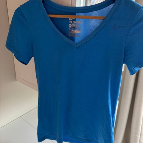 Selger en pent brukt Nike dri-fit t-skjorte i blå farge, størrelse L for dame. Laget med Dri-FIT teknologi som transporterer bort svette, egnet for fitnessaktiviteter.