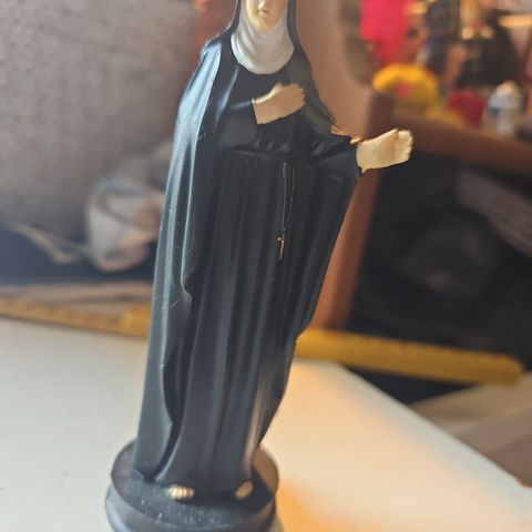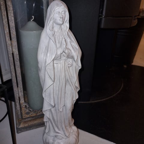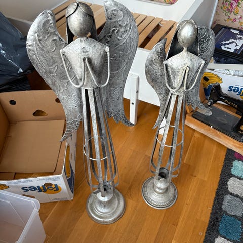 Statue av engel, sølv i farge og med glitrende detaljer. 36 cm høy