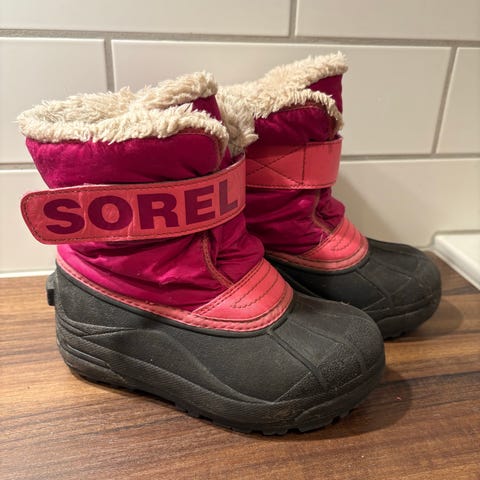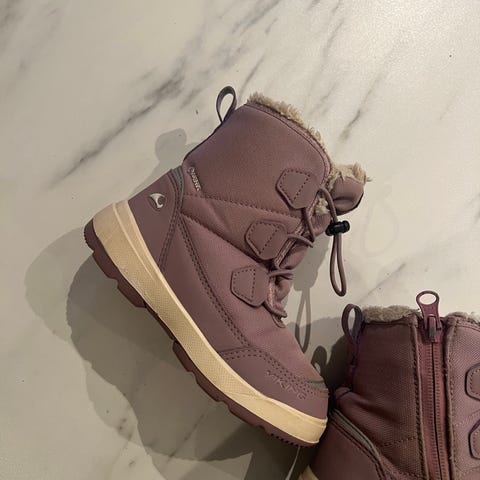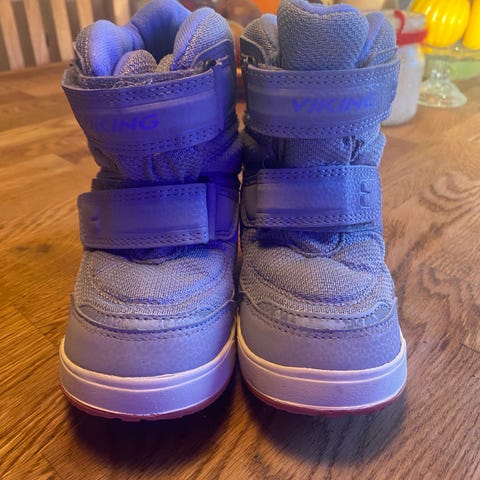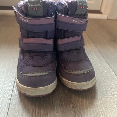 Viking Goretex barnesko for jente i størrelse 28. Skoene har en kombinasjon av tekstil og syntetiske materialer, med borrelås for enkel lukking. Egnet for utendørs bruk i kaldt vær.