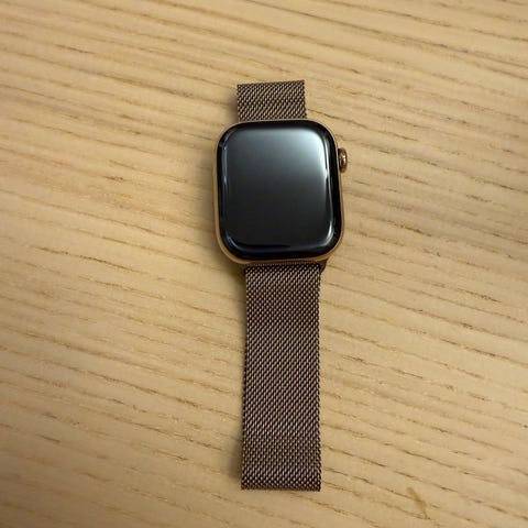 Apple Watch Series 10 smartklokke med svart reim. Enheten har en rektangulær skjerm og digital krone på siden. Passer til daglig bruk og helseovervåkning.