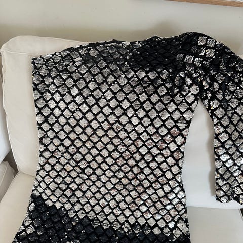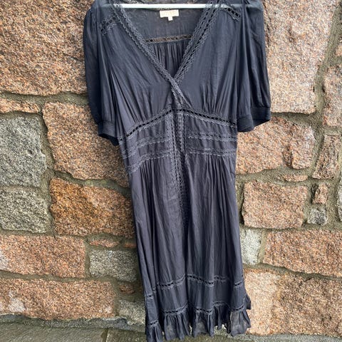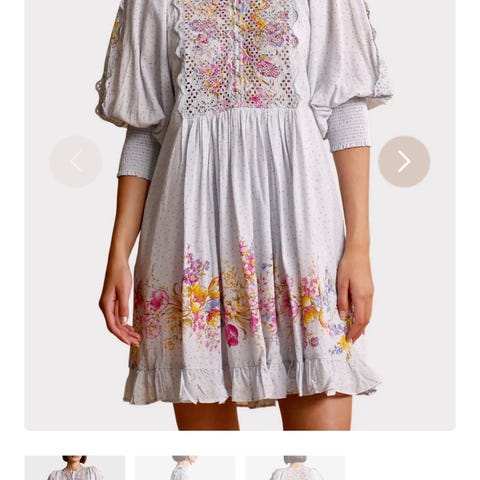 Kjole i flerfarget mønster, størrelse L for kvinner. Materiale og merke er ikke oppgitt. Kjolen har lange ermer og dekorative detaljer i svart stoff på bryst og ermer. Egnet for hverdagsbruk eller mer formelle anledninger.
