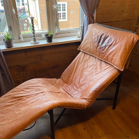 To nyoppussede stoler, teak og skinn. Pris for begge stoler, selges samlet. Solgt for dobbel prisantydning i utlandet.