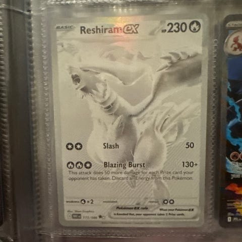Pokémon Reshiram EX samlekort med 230 HP. Kortet er i beskyttelsesplast og har illustrasjoner med glitrende effekter. Tekst på kortet er på japansk. Kan sendes . Kom med bud. Skal bort