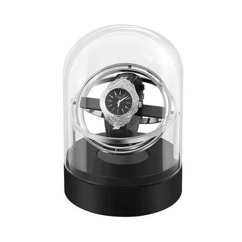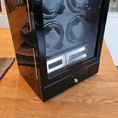 Watch Winder automatisk klokkerotator i mørkeblå farge. Enhet designet for å holde automatiske klokker i gang ved å etterligne håndbevegelser. Passer til ulike klokkemodeller. Den er uåpnet, nettopp mottatt i gave.