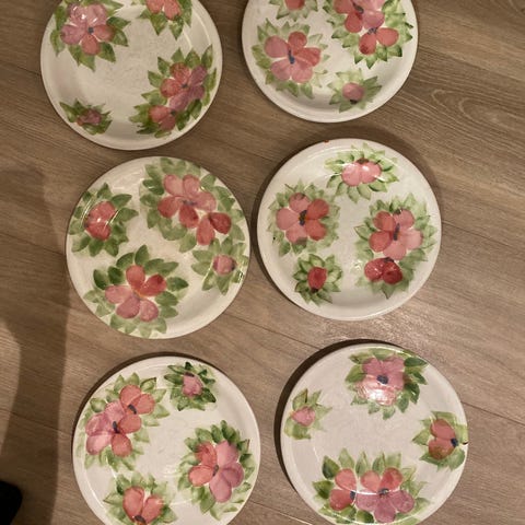 6 store og 5 mindre. Tallerkenene har en rund form med bølgete kanter og en glasert overflate.