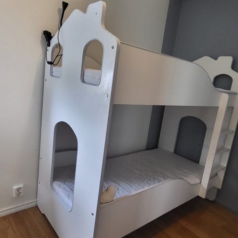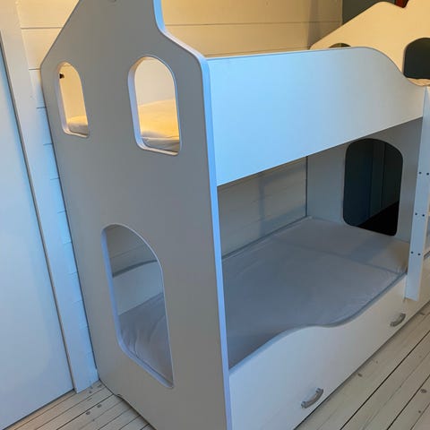 Praktisk løsning for å spare plass i rommet ved å ha to soveplasser i høyden, men den nederste blir da uten sengebunn (blitt brukt som gjesteseng med madrass og overmadrass, og sofa hos oss.
