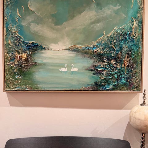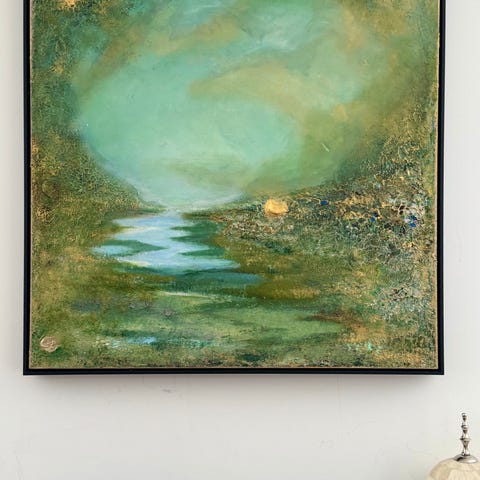 Med varme nyanser av gull, gront og dyp blå, kombinert med rik tekstur og dynamiske strok, bringer dette originale kunstverket en folelse av bevegelse og organisk eleganse.
