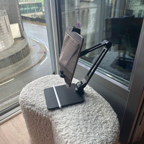 Selger et pent og lite brukt Twelve South HoverBar Duo 2nd generation justerbart stativ som utvider bruksområdet til iPad, nettbrett eller lesebrett. Både skrivebordssokkelen og den justerbare klemmen følger med.