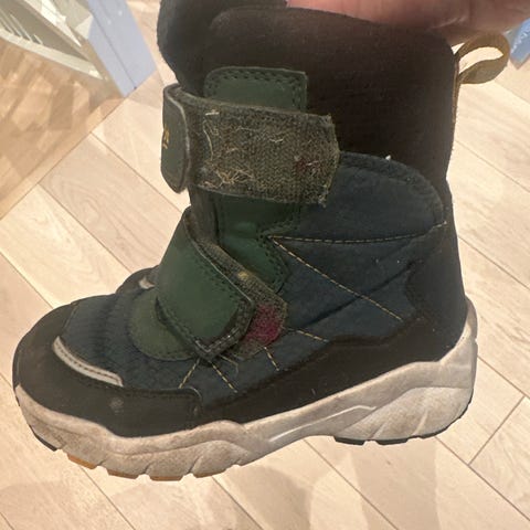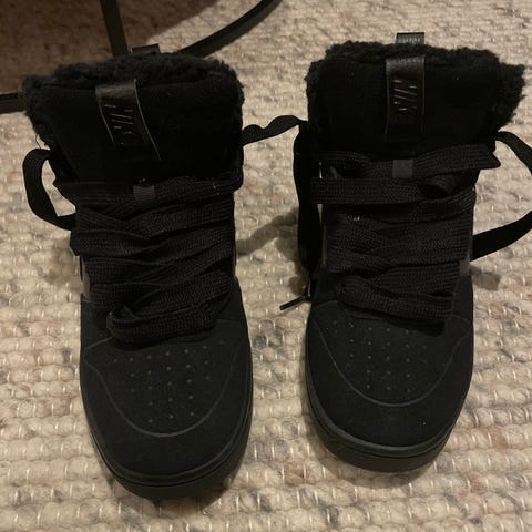 Nike unisex barnesko i størrelse 28. Skoene er svarte og har en foret innside for ekstra varme og komfort. Designet for barn, med borrelås og snøring for enkel tilpasning. Str 28,5