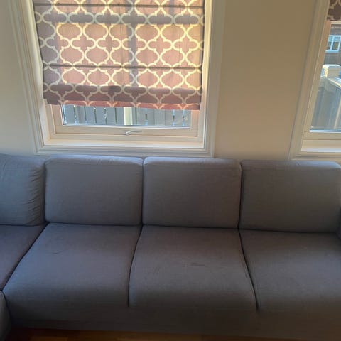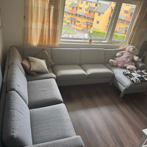 Godt brukt sofa fra Skeidar, slitasje er synlig på bildene.
