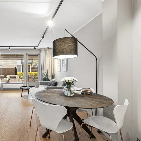 Pent og lite spisebord med fine stoler. Bordet er passe til en familiemiddag og tar liten plass.