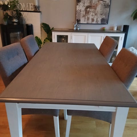 Pent brukt spisegruppe. Bord og stoler kan selges separat. Det følger med en ekstra plate som kan hektes på spisebordet.